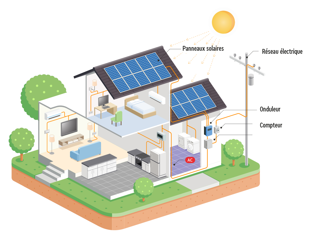 L’électricité produite peut être consommée immédiatement pour alimenter vos équipements du quotidien : éclairage, électroménager, chauffage, etc.